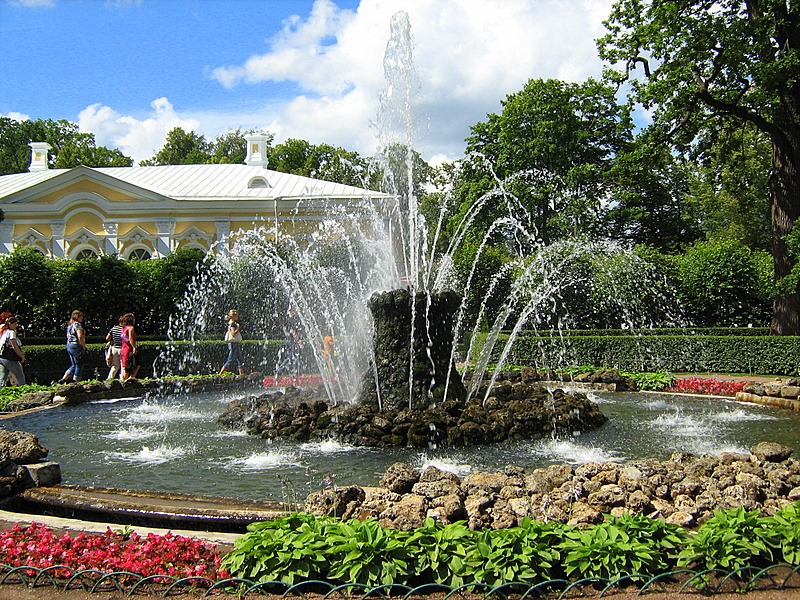 Этот фонтан находится перед южным фасадом дворца Монплезира - любимого детища Петра I и занимает в композиции главенствующее положение. В месте пересечения четырех симметричных частей (партеров) этих аллей и находится фонтан "Сноп". Он был спроектирован в 1721 году архитектором Н. Микетти по